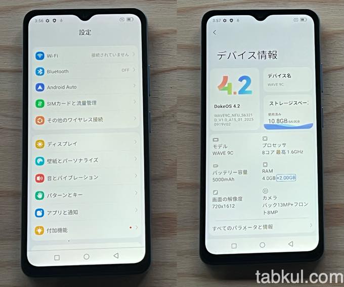 「Blackview WAVE 9C」は画面サイズ6.56インチ(解像度720×1612)、画面占有率94.94%と高く、輝度は600nitとしてエントリーモデルとしては高い仕様。