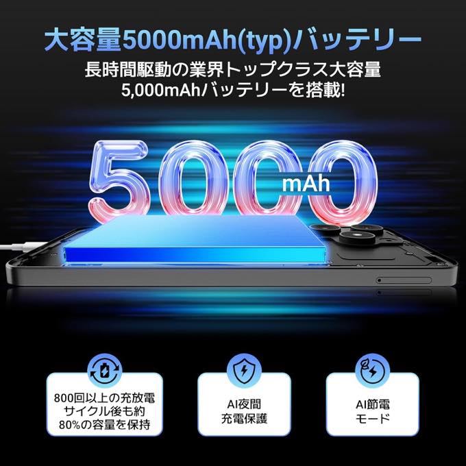 「Blackview WAVE 9C」のバッテリー容量は5000mAhと標準的。