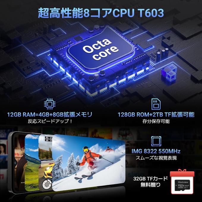 パッケージ表紙には防塵防水IP54対応の印字、シール風の箇所には内部ストレージ64GBとRAM合計12GB(物理4GB+仮想8GB)と案内されている。