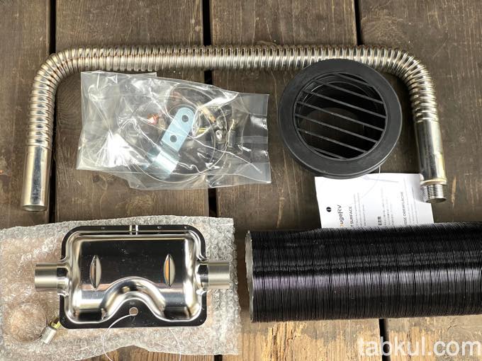 銀色のパイプとマフラーが排気用、黒色のタクトと吹き出し口が温風用。袋に入っているのはパイプを締め上げるグッズとなる。