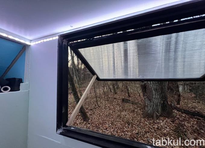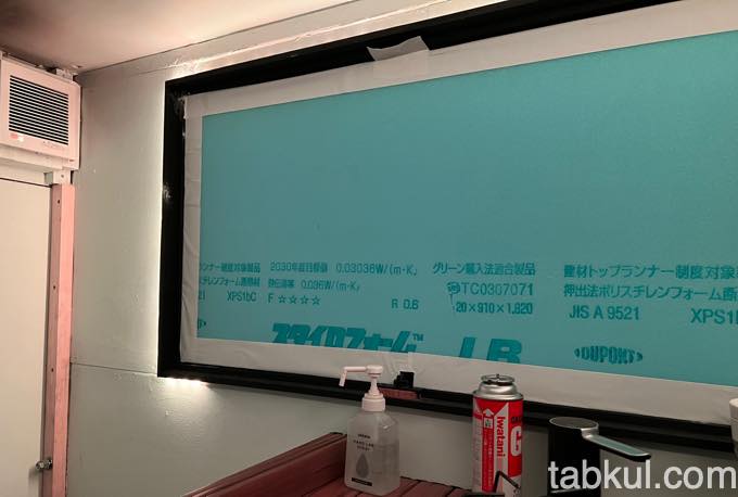 1日目で中空ポリカの1層では寒いと判断して、2日目の昼間にスタイロフォームで窓を塞ぐ工作をした。これによりシェルの壁と同等の防寒対策ができた。