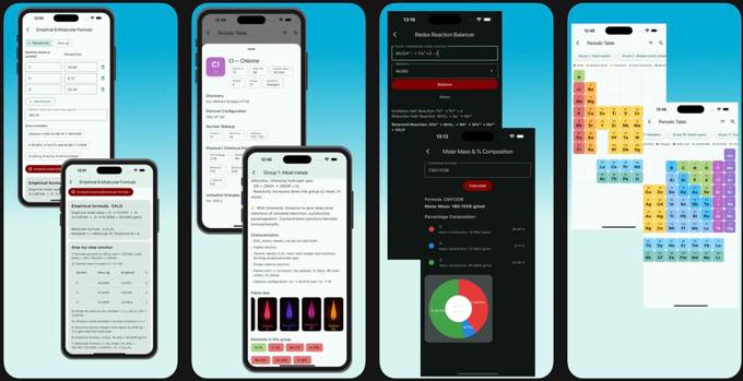 化学を学ぶ学生のためのコンパニオンアプリ。一般的な学校の実験のテスト、計算、化学元素の特性の調べ方など、すべてこのアプリでできます。