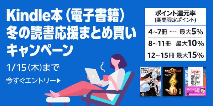 アマゾンジャパンの電子書籍サービスKindleストアにおいて、値引きキャンペーンやポイント還元イベントとは別枠で最大15%ポイント還元が受けられる恒例となっている”まとめ買い”としてKindle本「冬の読書応援まとめ買い」キャンペーンが開催されている。