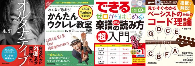 アコースティックギターの基礎トレーニングに関する本や定番のコード、進行に関する書籍、ウクレレの入門書など、様々なタイトルが並ぶ。