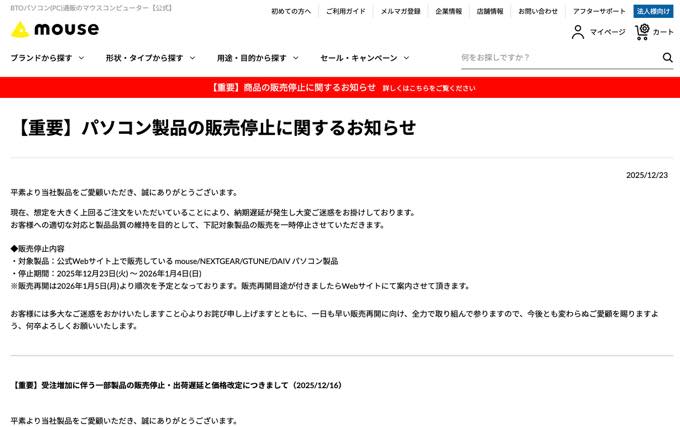 同社によれば公式Webサイト上で販売している mouse/NEXTGEAR/GTUNE/DAIV パソコン製品を対象に今月23日から2026年1月4日(日)まで販売停止するという。