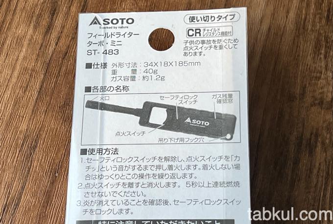 新富士バーナー株式会社が展開するアウトドア向けブランド「SOTO」の中で格安ながらクールなデザインが好評な「フィールドライターターボミニ ライター ST-483」を購入した。