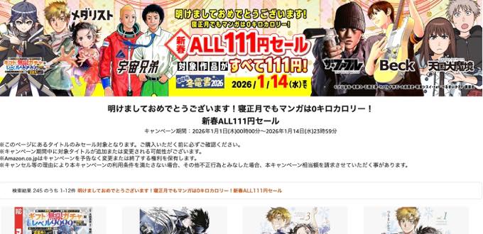 アマゾンジャパンの電子書籍サービス”Kindleストア”において、2026年で最初のキャンペーン「新春ALL111円セール」が開催されている。