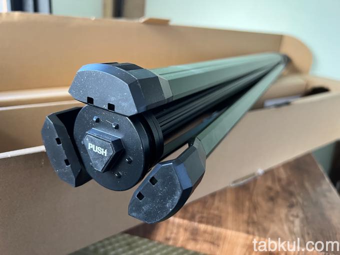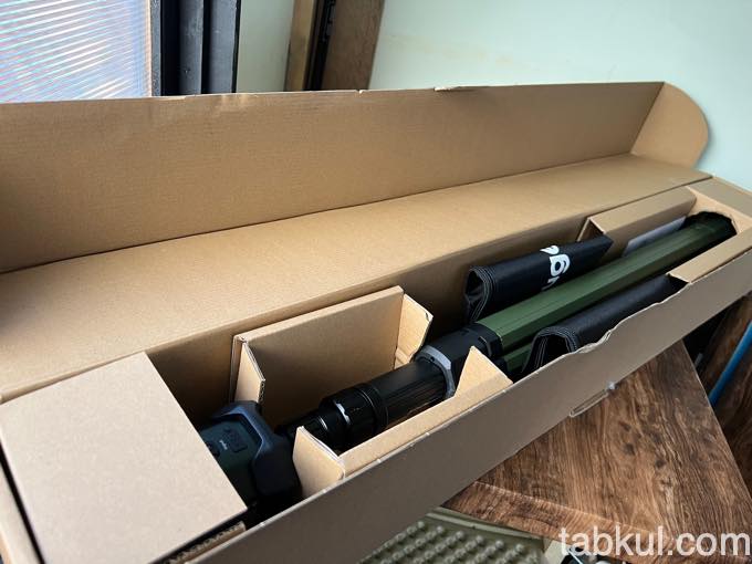 LEDランタンだと油断していると、上図のような長細い梱包段ボールで届くので注意したい。置き配は目立ち、宅配ボックスには入らないサイズ感。余裕を持った配送スケジュールが良さそうだ。