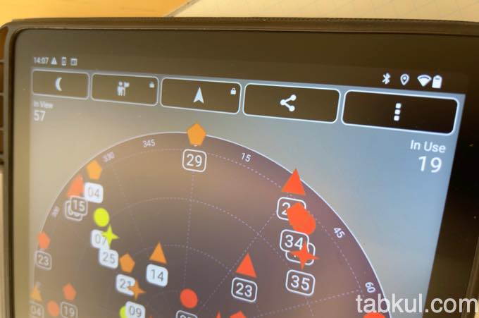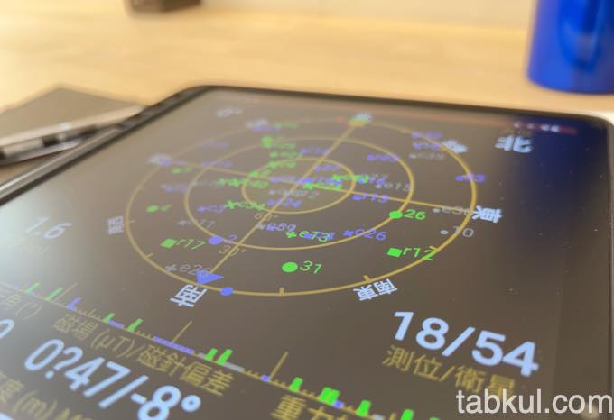 アプリを起動してから1分ほど待つと上図のように衛星を54基みつけて18基ほど捕捉していた。