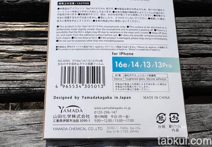 パッケージ背面には正式名称と思われる「No.3050」や「左右のぞき見防止ガラス保護フィルム」といった名称。材質に強化ガラス、シリコーン粘着剤が使われていることが記述されていた。
