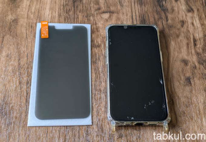 上図の左端に写っているのがダイソー版、iPhone 13 Proにはセリア版を貼って正面から撮影した映像だ。プライバシー機能で画面が暗くなるかと思っていたがベース状態では暗くならないらしい。