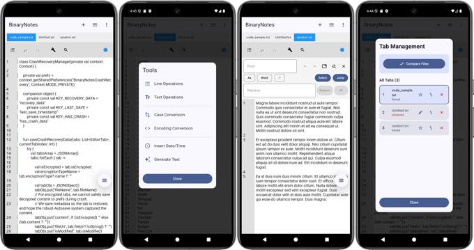 外出先でのコーディング、メモ作成、設定ファイルの編集など、BinaryNotes はポケットサイズのプロ仕様のテキスト編集ツールを提供します。サブスクリプションや広告は一切ありません。ツールだけを備えています。