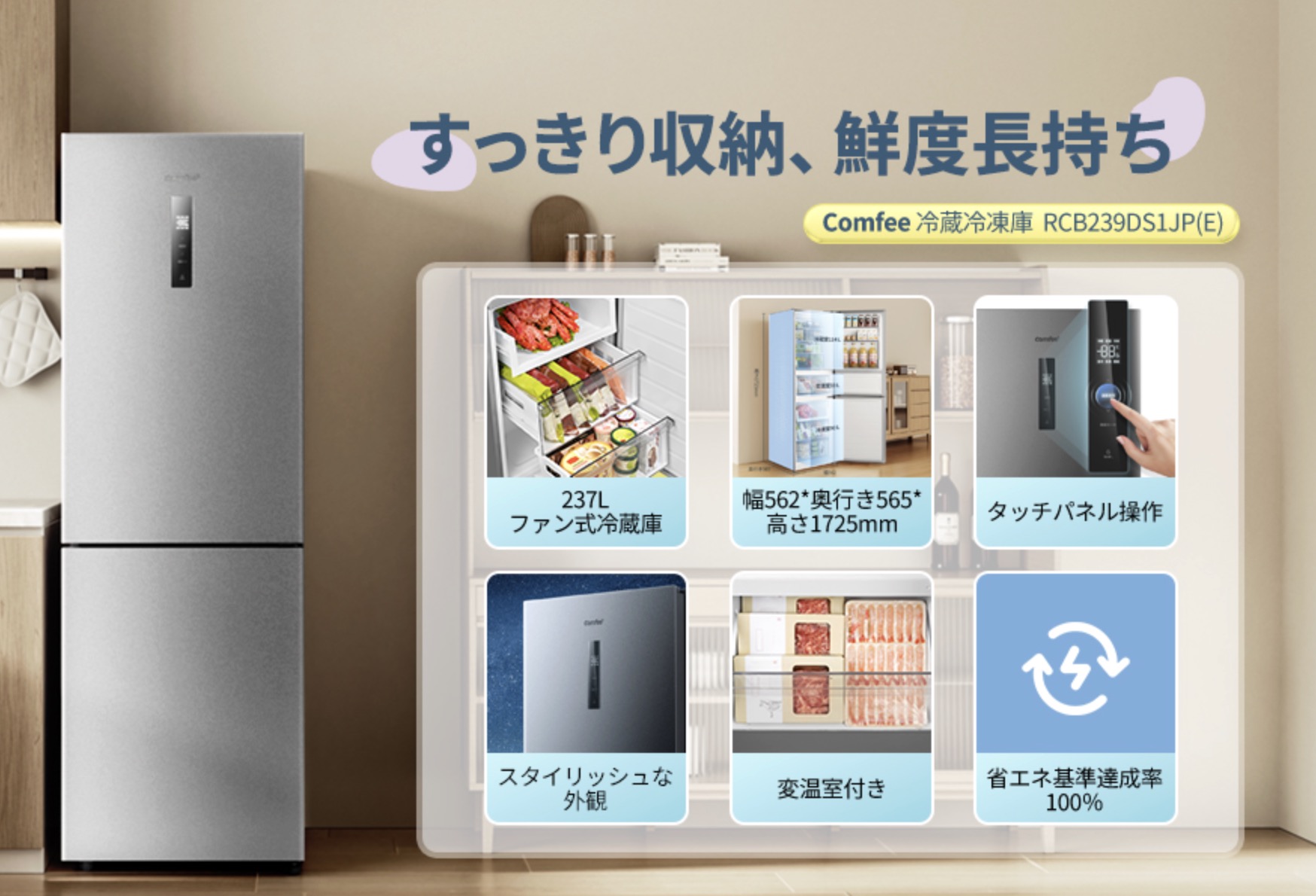 (期間限定14%OFF)COMFEE’ 自動霜取り冷蔵庫 237L「RCB239DS1JP(E) 」が特価に、スペック