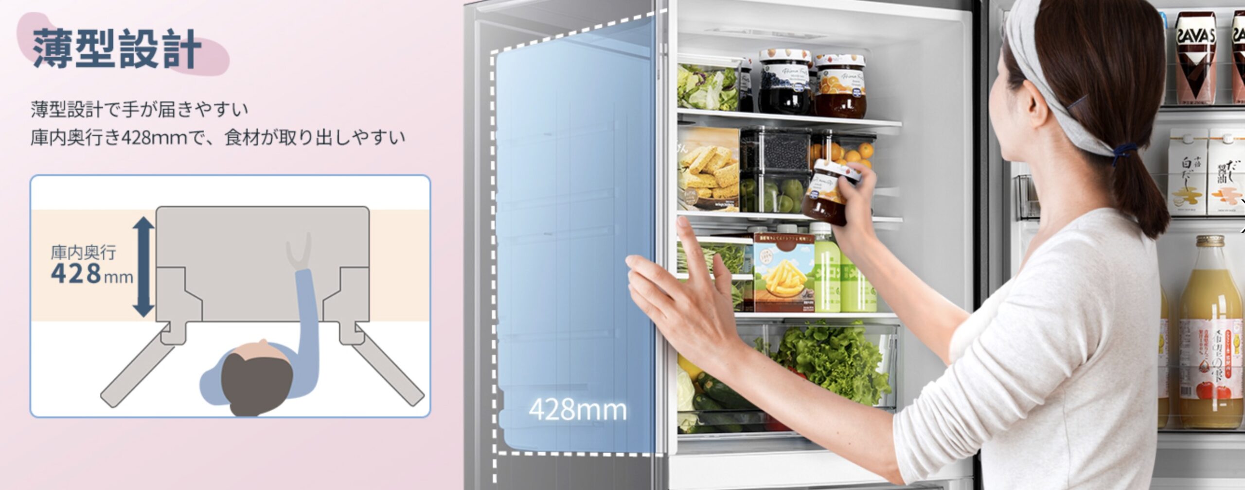 冷蔵庫としての容量は237Lと家族向けの大容量だが、本体サイズ1725x565x562mmというスリム設計なのが大きな特徴。