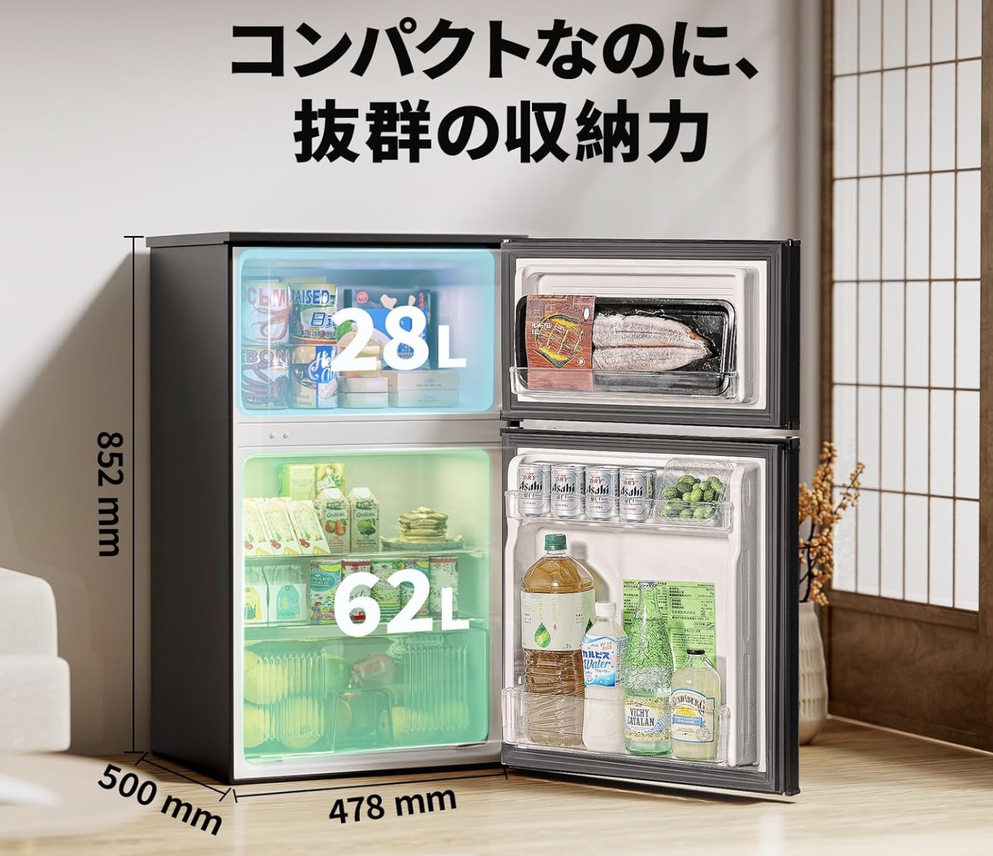 一人暮らしから二人暮らし、サブ冷蔵庫としても使える90Lという容量。冷凍室は28Lで上部にあり、冷蔵庫は62Lとなっていt。