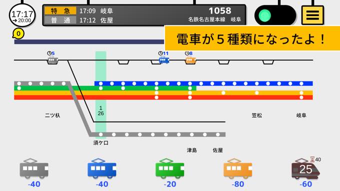 今作では、車両数の調整をしなくてよくなりました。その代わりに、電車を最大で5種類、運行できるようになりました。
