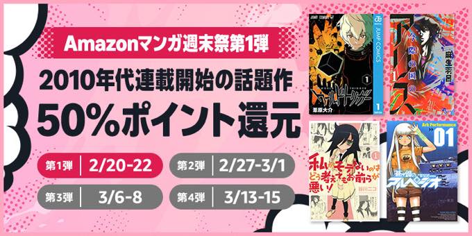 アマゾンジャパンの電子書籍サービスKindleストアにおいて、2010年代に連載開始した話題作を一律で50%ポイント還元するという「Amazonマンガ週末祭第1弾」が開催されている。
