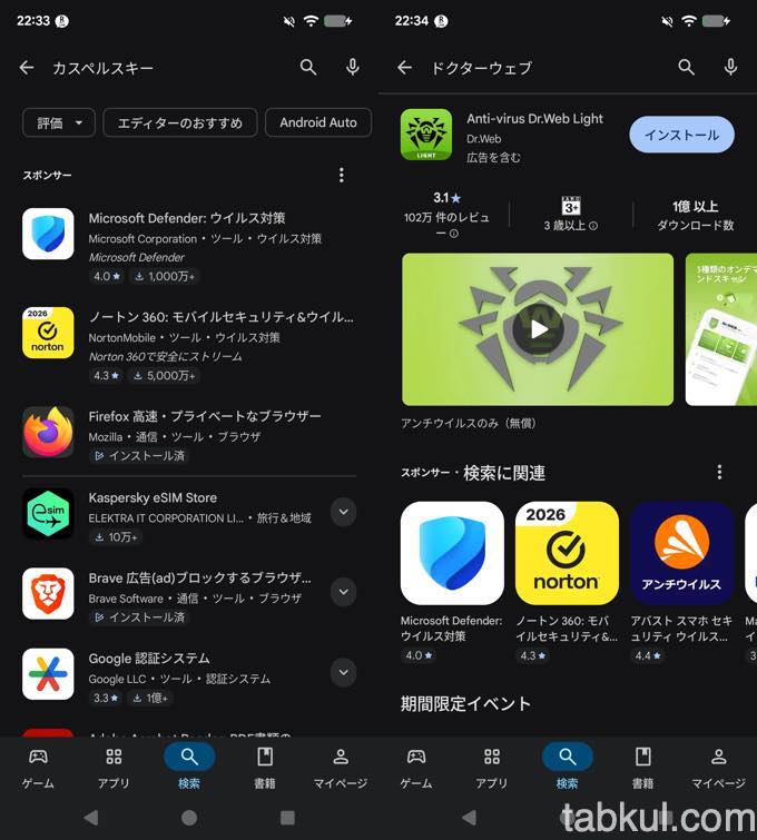 どうしてもPlayストアからウィルスチェックをしたい場合は上図右にある「Dr.WEB」を使うと良い。