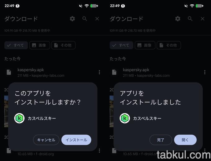 APKファイルを選択するとインストールの確認画面(上図左)が表示される。