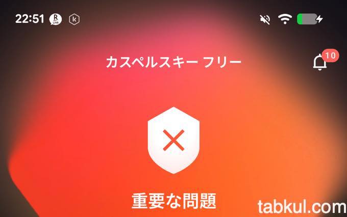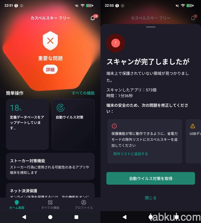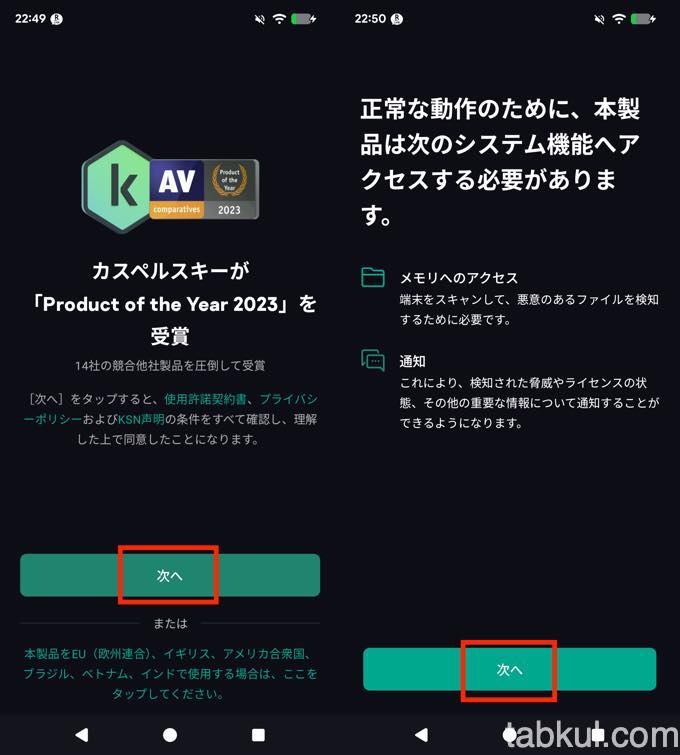 カスペルスキーのアプリが開くと最初に受賞報告が表示(上図左)されるが「次へ」を選択。