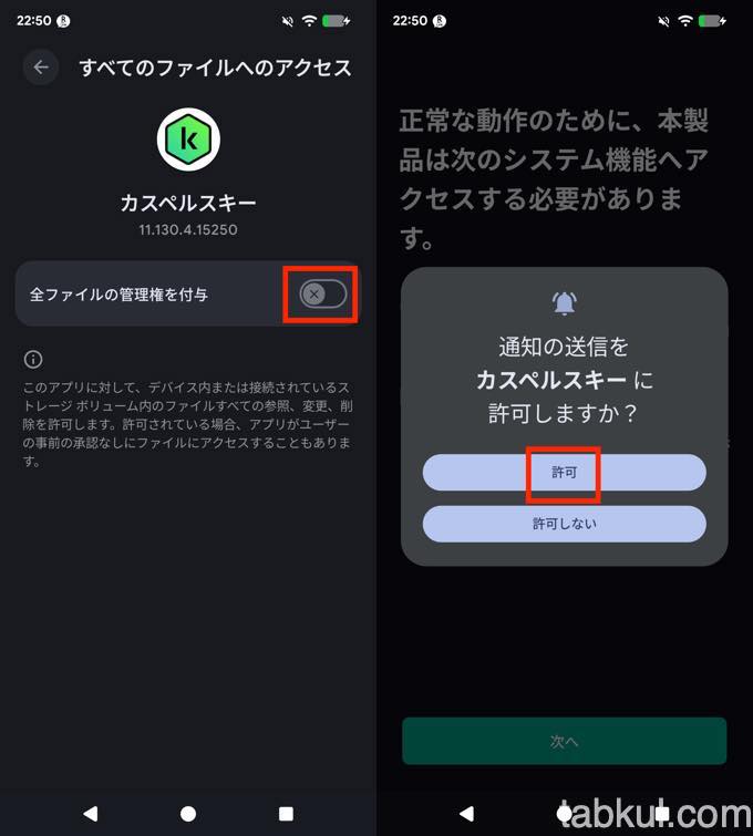 ウィルスチェックをするために必要な全ファイルの管理権限を付与するためにトグルをON(上図左)にする。