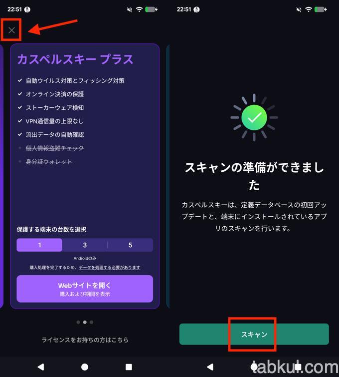 上図左の画面が表示されたら赤い四角で囲ったバッテンを選択しよう。それ以外を選ぶとカスペルスキーのサブスクを購入することになる。