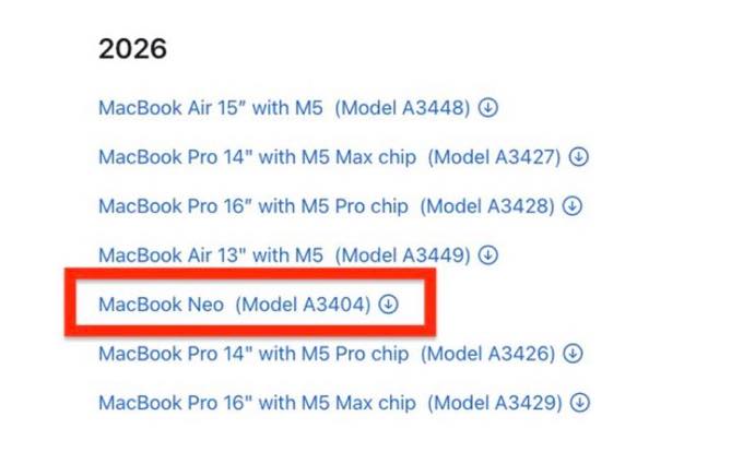 海外メディアの速報によれば2026年リリースのiPhone17eなどと同じ「2026」のカテゴリーに「MacBook Neo」が掲載されていたという。