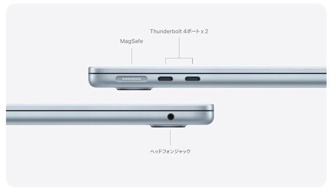 インターフェイスはMagSafe 3充電ポートが1基、Thunderbolt 4(USB-C)が2基いずれも正面から左側面に配置されている。その反対、右側面には3.5mmイヤホンジャックを配置。