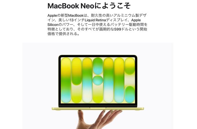 MacBook Neoは本日3/4より予約注文の受付を開始、発売日は日本時間3月11日。