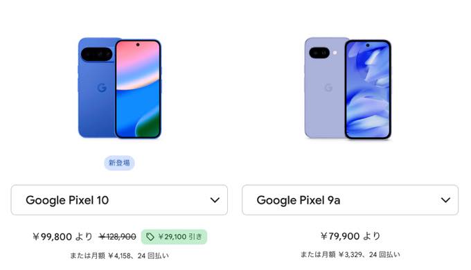 Googleストアの定価購入なら50,000円差となる。ただ春キャンペーンでPixel 10だけ29100円引きとなっていて99,800円で購入可能。その差は20,000円にまで迫る。