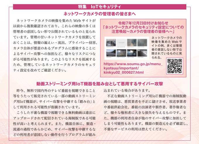 総務省(PDFへ)は2月1日から3月18日のサイバーセキュリティ月間を伝えるマガジン内の特集記事において、動画ストリーミング用IoT機器を踏み台として悪用するサイバー攻撃について注意喚起を行っている。