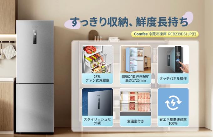 自炊する一人暮らしから二人暮らし、3人家族でも対応できるであろう大容量237Lの「COMFEE RCB239DS1JP(E)」が14%OFFセールを実施している。