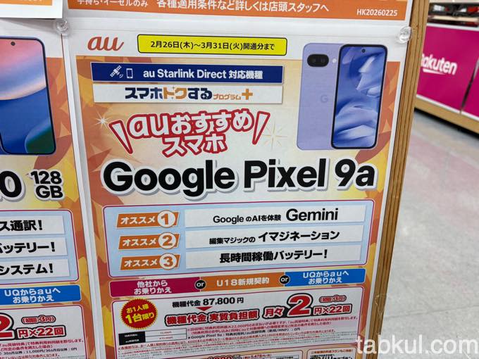 そこで今回は先月(2026年2月)Pixel 9aがお得だったUQモバイルに行って3月現在でも魅力的なプランなのか尋ねてきた。