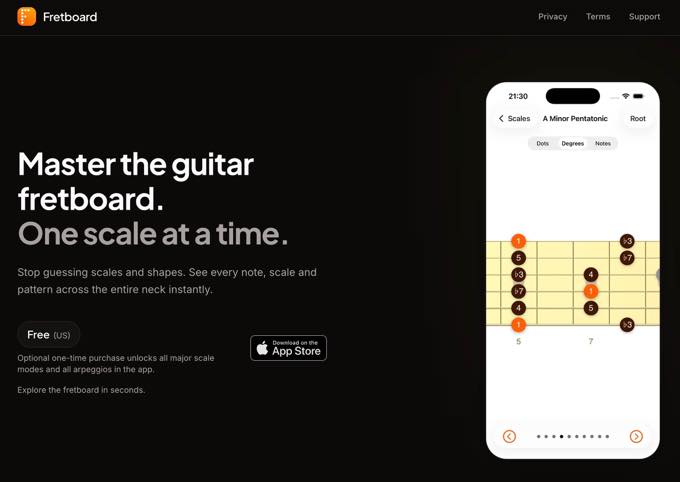 スケールや形を推測するのはもうやめましょう。フレットボードはギターを視覚的な地図に変え、ネック全体のすべての音、スケール、パターンを瞬時に表示します。