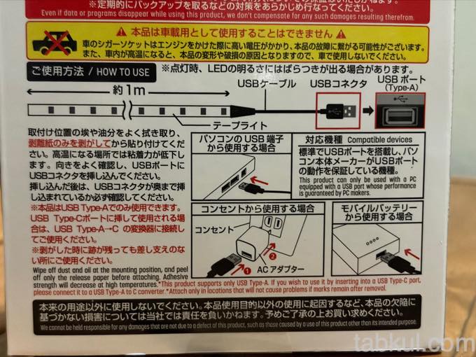 上図は製品パッケージの背面だが、ご覧のようにUSB-Aポートなので前述のAC接続タイプにあった12.8V→100V→5Vという2段階の電気ロスがない。