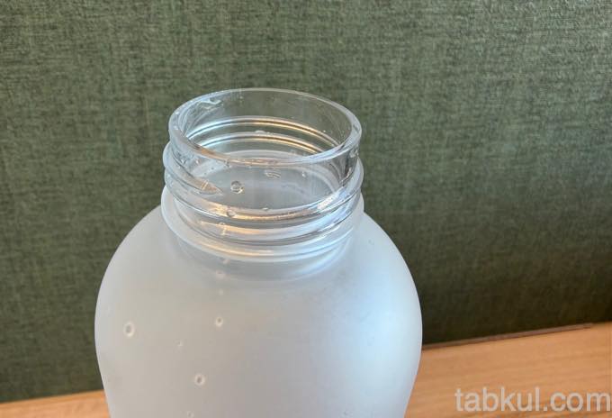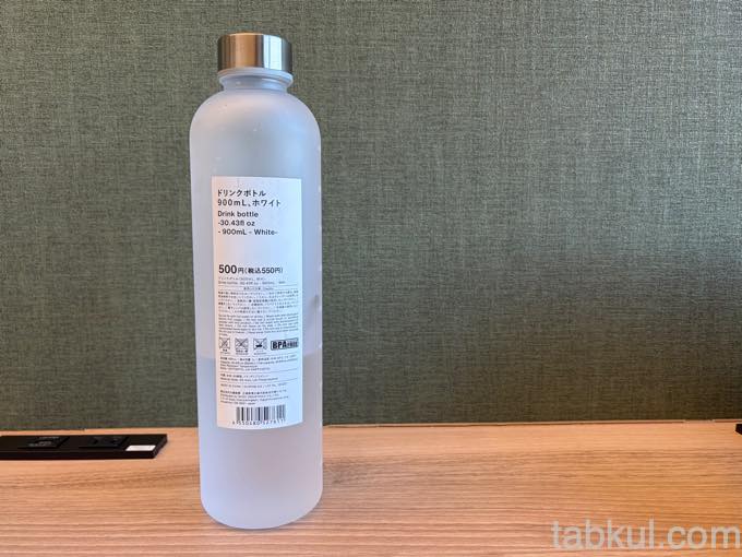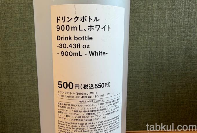 スタンダードプロダクツの900mlドリンクボトル、ラベルにある説明では満水時1Lになるという。目盛りは900mlまでが印字されている。