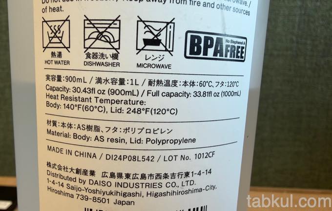 クリアなペットボトルといえばナルゲンボトルのような「トライタン」が有名だが、本製品は下図のようにBPAフリーといったよく見かける言葉が並ぶものの素材はAS樹脂となっている。