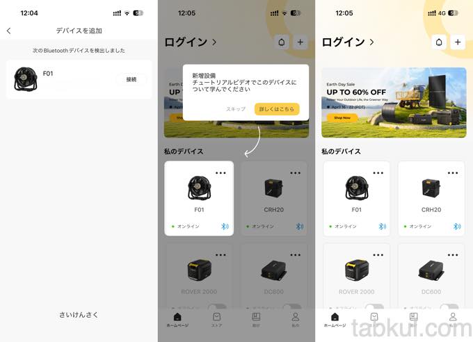 上図右がデバイス一覧に追加された「BougeRV F01」で、内蔵バッテリーがあれば「オンライン」というステータスとBluetoothアイコンが青く表示されている。