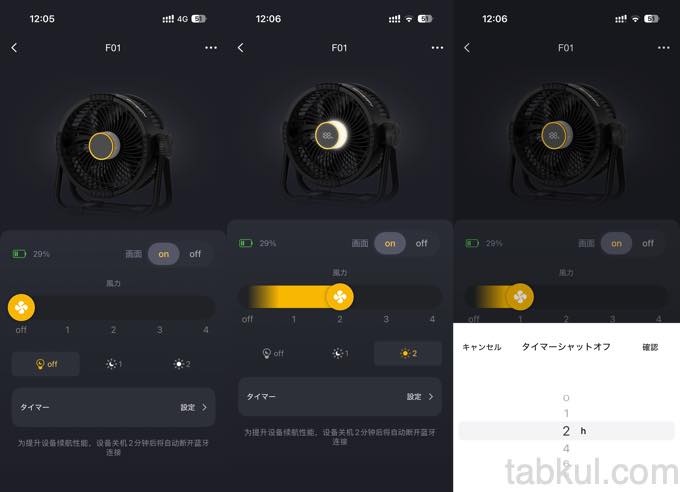 黄色いスライドバーは風量で、最大4段階まで調整可能となっている。