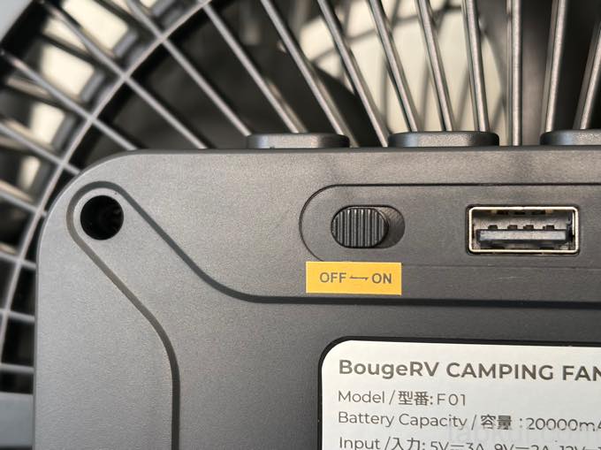 「BougeRV F01」は日中、夜と早朝はダイソー扇風機といった感じにしている。